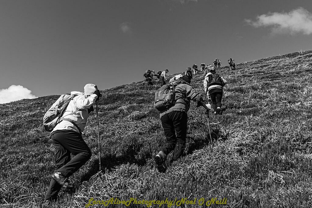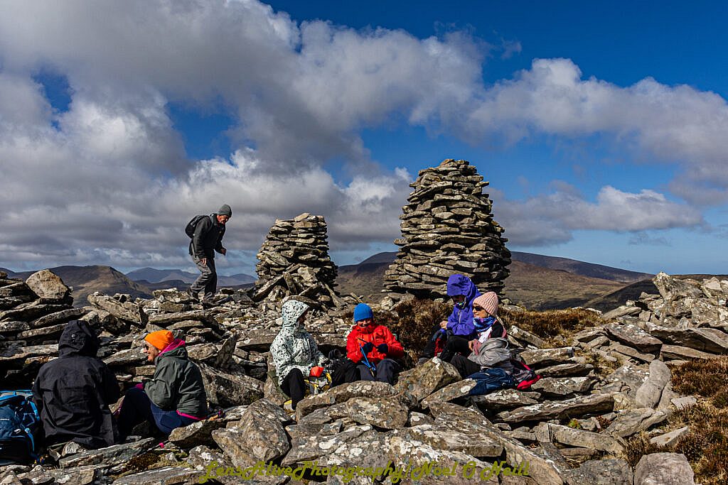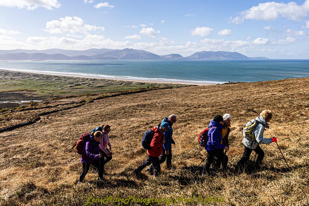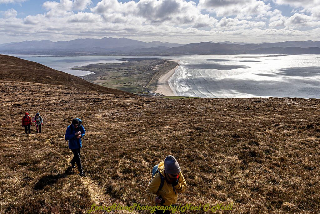 Leaving the car park, we turn left on the main R561 road before immediately turning right uphill. After a short climb we again turn right at a junction to continue walking along the Dingle Way. This section of the walk is along a pleasant fuschia clad boreen. Soon we reach the eastern shoulder of the hill at Inch East and begin heading towards an unnamed peak over heather covered ground. The climb is rewarded by views of Inch Spit and Castlemaine Harbour. Heading in a northwesterly direction we reach a second unnamed peak before eventually arriving at Brickany Hill at 374 meters. From here we have views west to the Blasket Islands and south to the Iveragh Peninsula and the Reeks Mountain Range.